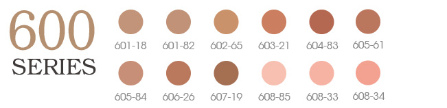 600系列 幾近完美的修飾粉紅色、紅、藍色、紫色或咖啡色眼圈、眼袋或胎記、深色疤痕、斑點、刺青等。可單獨使用或與其他粉底調和使用。(共12色)